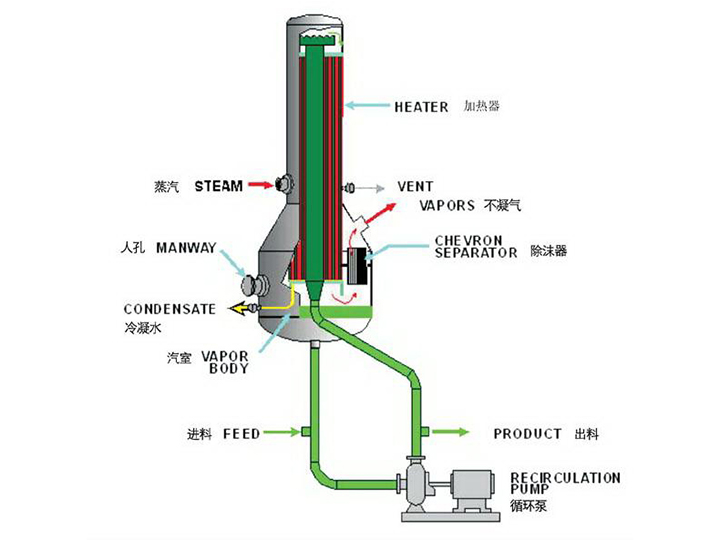 需濃縮的料液由泵送入加熱管頂部,沿著加熱管內(nèi)壁形成液膜向下流動(dòng)。在這個(gè)過(guò)程中,由于管外的加熱,管內(nèi)液膜開(kāi)始沸騰并部分蒸發(fā)。在列管下部分及其下游的分離器中,剩余的液體和蒸汽得以分離。